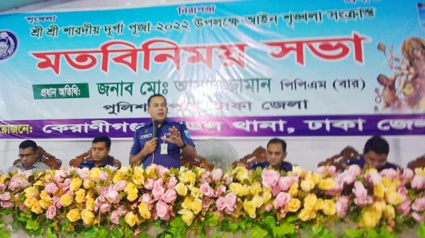 এ সময় উপস্থিত ছিলেন ঢাকা জেলার অতিরিক্ত পুলিশ সুপার ( প্রশাসন ) মোঃ নূর আলম, অতিরিক্ত পুলিশ সুপার( অপরাধ) আমিনুল ইসলাম, অতিরিক্ত পুলিশ সুপার (ডিবি) মোবাশ্বিরা হাবিবা খান, অতিরিক্ত পুলিশ সুপার (ট্রাফিক) আবদুল্লাহ হিল ক্বাফী, কেরানীগঞ্জ মডেল থানা অফিসার ইনচার্জ মামুনুর রশীদ, কেরানীগঞ্জ মডেল থানা শারদীয় দূর্গা পূজা উদযাপন কমিটির সভাপতি গোপাল সরকার ।