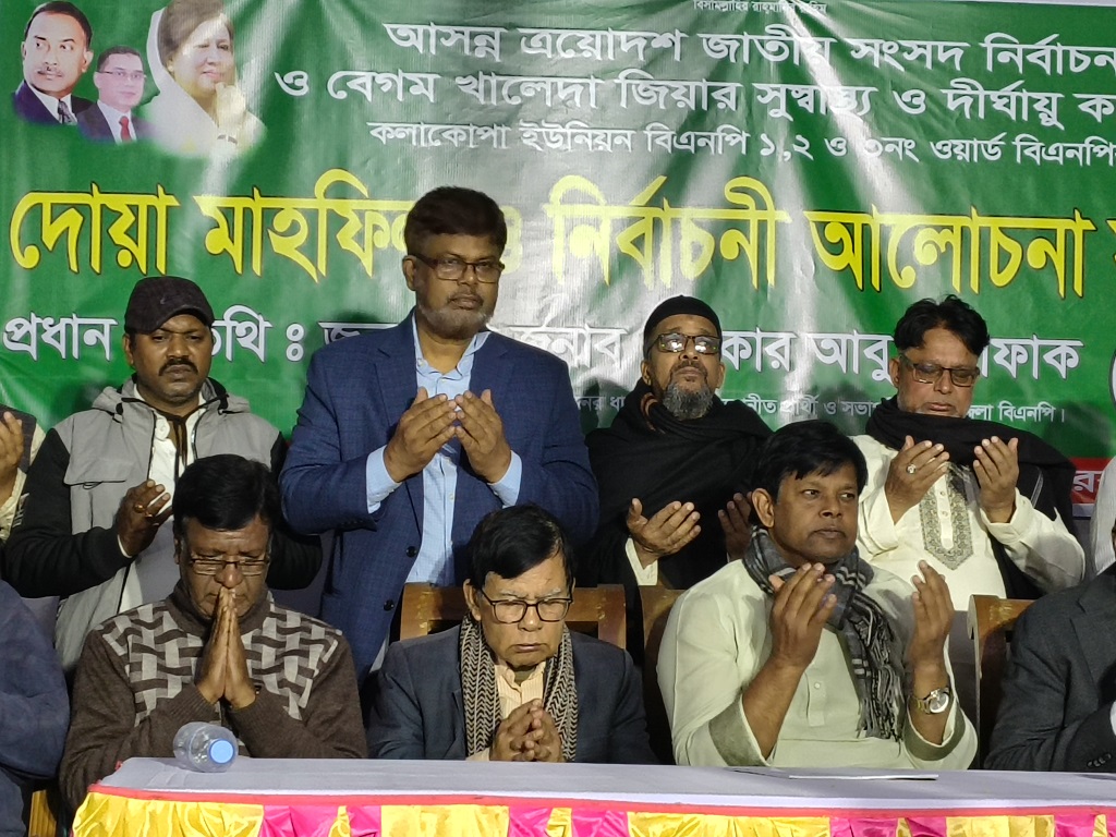 ঢাকার নবাবগঞ্জ উপজেলায় বিএনপির নেতাকর্মী ও সমর্থকদের নিয়ে দেশনেত্রী বেগম খালেদা জিয়ার আশু সুস্থতায় কামনায় দোয়া মাহফিল ও আলোচনা সভা অনুষ্ঠিত হয়েছে। সোমবার রাত সাড়ে ৯টায় কলাকোপা পুকুরপাড় খন্দকার বাড়িতে এ অনুষ্ঠানের আয়োজন করেন কলাকোপা ইউনিয়নের ১,২ ও ৩ নং ওয়ার্ডের বিএনপি ও সকল অঙ্গসংগঠন।