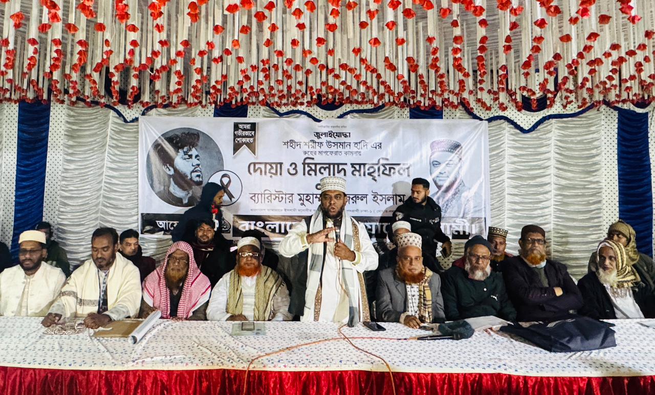 ঢাকার দোহারের শিলাকোঠায় শহীদ শরীফ ওসমান হাদির মাগফেরাত কামনায় দোয়া ও মিলাদ মাহফিলের আয়োজন করা হয়। বৃহস্পতিবার (৮ জানুয়ারি) সন্ধ্যা সাড়ে ৬টায় দিকে কুসুমহাটি ইউনিয়নের ২ নং ওয়ার্ড আয়োজিত অনুষ্ঠানে সাবেক চেয়ারম্যান হাফেজ আব্দুল ওয়াহাব দোহারীর সভাপতিত্বে প্রধান অতিথি হিসেবে উপস্থিত ছিলেন ঢাকা ১ আসনের জামায়াতে ইসলামীর মনোনীত এমপি প্রার্থী ব্যারিস্টার মুহম্মদ নজরুল ইসলাম।