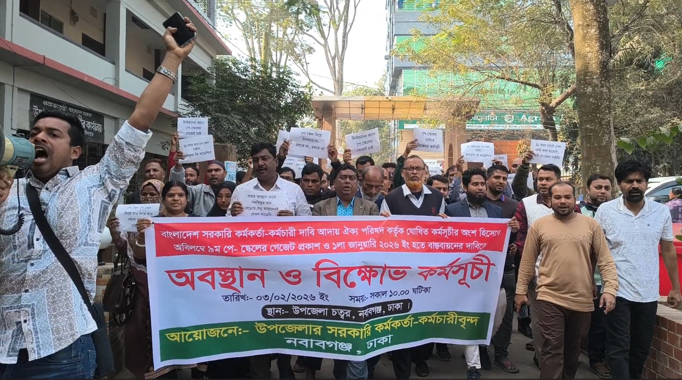 নির্বাচনের আগে নবম পে-স্কেল বাস্তবায়নের দাবীতে ঢাকার নবাবগঞ্জে অবস্থান কর্মসূচি ও বিক্ষোভ মিছিল করেছে ১১ থেকে ২০তম গ্রেডের সরকারি কর্মকর্তা ও কর্মচারীরা। বাংলাদেশ সরকারি কর্মকর্তা-কর্মচারী দাবী আদায় ঐক্য পরিষদ কর্তৃক ঘোষিত কর্মসূচির অংশ হিসেবে অবিলম্বে নবম পে-স্কেলের গেজেট প্রকাশ ও ১ জানুয়ারি ২০২৬ হতে বাস্তবায়নের দাবীতে তারা এ কর্মসূচি পালন করেছে।