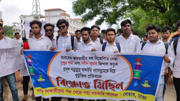 মহানবী হযরত মুহাম্মদ (সা.)-কে নিয়ে ভারতের ক্ষমতাসীন দল বিজেপির দুই নেতার কটূক্তির প্রতিবাদে ঢাকার দোহারে বিক্ষোভ মিছিল অনুষ্ঠিত হয়েছে।